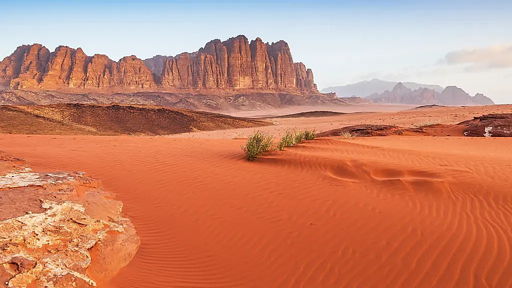 Am frühen Morgen entfaltet das Wadi Rum seine ganze Magie. In offenen Geländefahrzeugen unternehmen Sie eine etwa dreistündige Jeep-Tour durch die als UNESCO-Welterbestätte geschützte Wüstenlandschaft. Wie eine außerirdische Szenerie breiten sich rote Sanddünen, monumentale Felswände und weite Täler vor Ihnen aus. Das ständig wechselnde Licht lässt die Farben der Wüste von tiefem Ocker und Purpur bis zu leuchtendem Gold changieren. Kein Wunder, dass diese Landschaft T. E. Lawrence, den legendären „Lawrence von Arabien“, ebenso inspirierte wie zahlreiche Künstler und Filmemacher bis in die Gegenwart. Im Anschluss verlassen Sie die Stille der Wüste und fahren hinab zum Roten Meer nach Aqaba, Jordaniens einziger Hafenstadt. Hier erleben Sie bei einem Stadtrundgang den reizvollen Kontrast zwischen traditionellem Orient und moderner Urlaubsatmosphäre. Sie sehen die historische Festung, schlendern durch lebendige Marktviertel und entlang der Uferpromenade, wo sich das tiefblaue Meer, Cafés und Palmen zu einer entspannten Küstenszenerie verbinden. Der restliche Tag steht Ihnen zur freien Verfügung, um die besondere Atmosphäre Aqabas zu genießen oder erste Eindrücke am Roten Meer zu sammeln. Übernachtung im Oryx Hotel (bei Buchung des Premiumpakets im Mövenpick Resort Tala Bay).